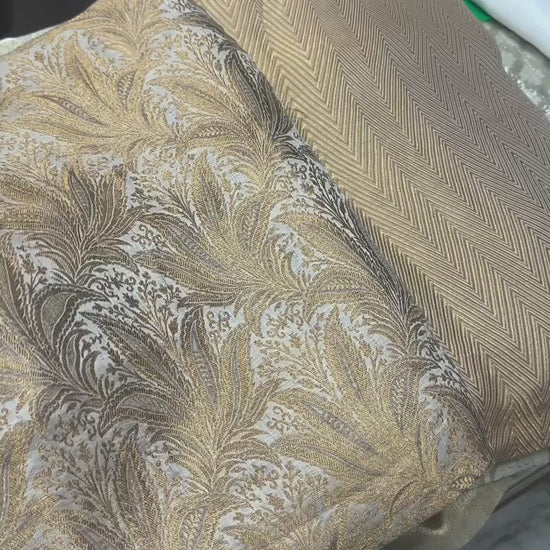 100% pure Atlas Jamawar shirt fabric drenched in warm copper tones, woven with intricate traditional paisleys and florals that shimmer softly. Second design is also a unique zigzag design.